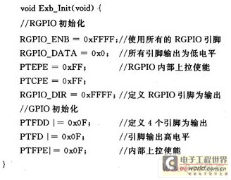 了解底层寄存器后,笔者对外部总线接口实现的底层函数做了通用性的封装,共包括3个函数:外部总线接口初始化函数void Exb_Init(void);外部总线写函数void Exb_QueuedWrite(word*pAddr,word*pData,bytenTransfer);外部总线读函数void Exb_QueuedRead(word*pAddr,word*pData,byte nTransfer)。Exb_QueuedWrite函数进行nTransfer次写操作,将数据数组中的数据写入地址数组中的地址。Exb_QueuedRead函数进行nTransfer次读操作,将地址数组中地址对应的数据读出放人数据数组中。其中Exb_Init函数代码如下: