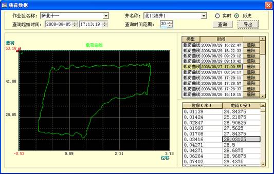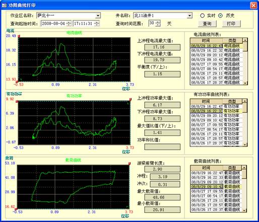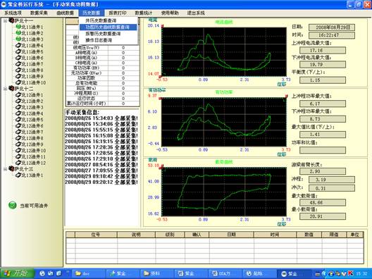 系统菜单包括:系统设置,数据采集,曲线数据,历史数据,报表打印,数据统计,使用帮助,退出系统。利用导航数组件,用户可以方便的选择相应的设备名称,油井当前的各项参数可以直观的显示在界面中,电流、功率、载荷以曲线图的形式显示。各种曲线提供历史查询和打印的功能,如下: