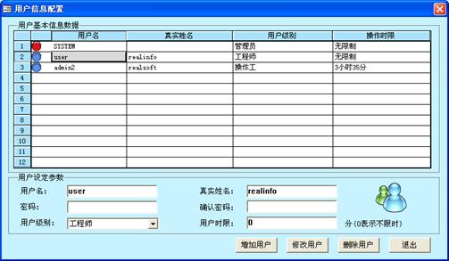 具有管理员权限的用户可以增加、修改、删除用户,每一个用户都可以设置用户名、真实姓名、密码、用户级别、用户时限等。不同的用户有不同的操作权限。