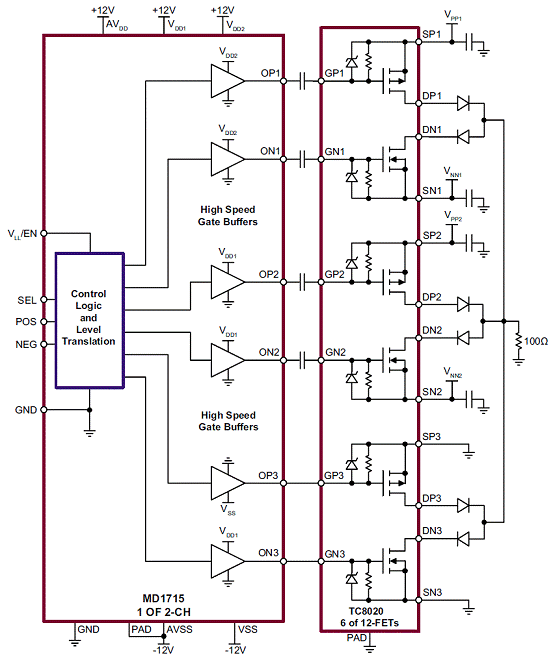 The Supertex MD1715, paired with the Supertex TC8020, forms a two channel, five level, high voltage, high speed transmit pulser chip set. The chip set is designed for medical ultrasound imaging applications, but can also be used for metal flaw detection, nondestructive evaluation, and piezoelectric transducer drivers.