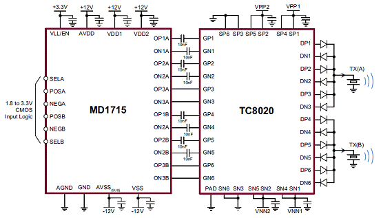 Supertex公司的 MD1715和TC8020是高清医疗超声图像应用芯片组。MD1715是两路五级高压高速脉冲发送芯片,采用先进的CMOS技术,±4.5 到12.5V工作电压,输出电流2A,1nF负载的上升和下降时间6.5ns,传输时延10ns,1.8V-3.3V CMOS逻辑电平,而TC8020由六对高压低阈值N沟和P沟MOSFET组成,集成了栅极-源极电阻和齐纳二极管,50V时的峰值电流+/-3.5A。本文介绍了MD1715和TC8020主要特性。MD1715和TC8020典型应用电路,以及详细电路图。