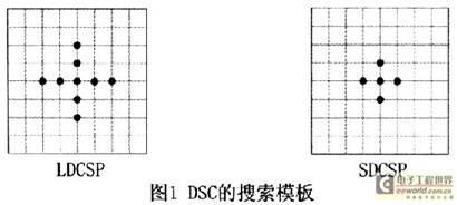 菱形十字搜索算法(DCS)算法是在DS算法基础上改进而来,DCS的匹配模板是建立在两种不同的搜索模板之上的,即大菱形十字型(LDCSP)和小菱形十字型(SDCSP),如图1所示。其中,十字型可以对应于实际的运动的矢量分布,而交叉型则是为了加速搜索效果。