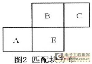 运动矢量空间域的预测方式有运动矢量中值预测、空间域的上层块模式运动矢量;在时间域的预测方式有前帧对应块运动矢量预测和时间域的邻近参考帧运动矢量预测。本文采用运动矢量中值预测方式。根据与当前E块相邻的左边A块,上边B块和右上边C块的运动矢量,取中值作为当前块的预测运动矢量。如图2所示。