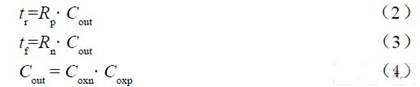 反相器下降延迟t f 和上升延迟t r 根据下列公式定义,式中Rn、Rp 分别为图2(b)中反相器PMOS管M0、M1 和NMOS 管M2、M3 的等效电阻,Cout 为反相器输出电容。