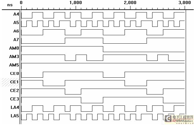 由以上分析及逻辑推理确定了 GAL 芯片要实现的功能以后,根据总线协议和硬件电路 即可得到相关信号之间的逻辑关系,本文据此完成了相应ABEL-HDL 程序编写并利用 Lattice 公司的专用开发工具ispLEVER5.1 对GAL 芯片程序进行了编译和仿真调试,其地址 译码控制过程仿真波形如图2 所示。