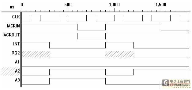 图 3 是该程序在ispLEVER5.1 中的仿真波形图。在该图中,从设备板上的Z8536 通过 将INT 拉低请求一个权限为IRQ2 的中断,译码识别代码为010。由图可见,当A[3~1]为 010 时,菊花链停止传送,否则由IACKOUT 传出。