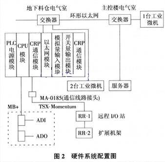 新增控制设备" title="控制设备">控制设备的配置:辅原料及铁合金上料PLC的IP地址为已有系统的IP地址,另在远程机架上增加2块数字量输入模块DDI、2块数字量输出模块 DDO。并在主机架上插入3块Profibus-DP通信模块CRP,通过通信模板与现场I/O通信设备进行现场总线的连接,现场设备由Turck公司现场总线模块所构成,其硬件系统配置见图2。