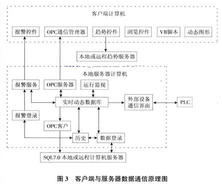 120t转炉自动上料系统的上位监控和服务器应用OPC(OLE for Process Control)界面进行通信。作为 Client/Server结构,转炉主控室上位机的数据通过服务器采集并发至转炉上料工作站,工作站的指令也先发往此服务器再传至PLC系统。HMI上数据显示,设备状态监控标签均在服务器端建立,CRT操作也均通过服务器转发到PLC,以完成对生产过程设备的操作与监控。服务器放置SQL7.0大型数据库,通过ODBC接口与MP7实现连接,完成对历史数据的存储。通信原理如图3所示。