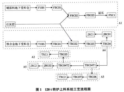 上料系统(A系统)由辅原料高位料仓" title="料仓">料仓上料系统(A1系统——原有系统延伸),铁合金中位料仓上料系统(A2系统——原有系统延伸),铁合金炉后料仓上料系统(A3系统——原有系统延伸),1号精炼高位料仓上料系统(A4系统——原有系统),2号精炼高位料仓上料系统(A5系统)共5个部分组成。工艺流程如图1所示。