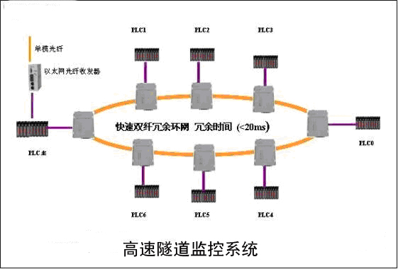 为保证隧道运行的可靠性,隧道内本地控制器之间网络的逻辑拓扑结构一般为环形结构。采用光纤把每个隧道的所有本地控制器(PLC设备)连接成现场环形控制网络,而且光纤物理路由均为双洞成环。
