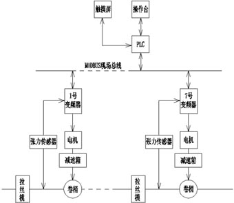 该系统用于4-9台直进式拉丝机的控制,控制方式为MODBUS(模拟量控制可选)。特点是所有参数开放。