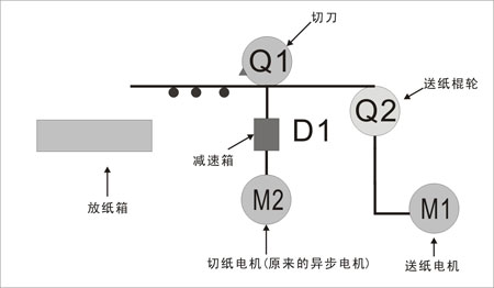老式切纸机比较简单,只用了一台异步电机带动,加上一台减速机来拖动送料及切刀,通过调节切刀减速比来改变切纸的长度,此方案简单,但切出纸的误差较大,造成产品一致性不好,而且每次切纸长度都靠人手动调节,既废料也费时。