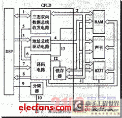 图2中1为DSP内部系统总线,2为外部数据总线,3为DSP内部地址总线,4为外部地址总线,5为数据总线收发电路使能信号,6为地址总线驱动电路使能信号,7为DSP输出控制总线,8为CPLD译码后输人DSP的信号线,9为DSP同步外围电路的时钟,10为DMA输人时钟,11为RAM,8237和声卡的读写信号,12为锁存信号,13为RAM的片选信号。