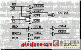 图3给出了EPM7128S内部译码电路主要的输入和输出信号以及它们的逻辑关系。其中DSP的地址选通信号和读写信号经译码分别得到IO读写信号和存储器读写信号;8237的DMA申请信号HRQ经反相后送到DSP的HOLD引脚以触发DSP中断,DSP在中断程序里发IDLE指令,HOLDA引脚变为低电子,响应DMA申请;同时数据总线和地址总线驱动电路的使能信号关闭,数据总线和地址总线为高阻态,从而8237可以接管总线,进行DMA操作。声卡的中断信号为高电子,须反相后再接DSP的中断引脚。