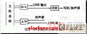 使用复杂可编程逻辑器件(CPLD)可提高系统集成度、降低噪声、增强系统可靠性并降低成本,同时它不仅具有电擦除特性,而且出现了边缘扫描及在线编程等高级特性,因而可用于状态机、同步、译码、解码、计数、总线接口等很多方面,在信号处理领域的应用也非常活跃。MAX7000系列是ALTERA公司采用先进的0.8μmCMOSEEPROM技术制造的高性能、高密度的CPLD[1]。MAX7000的结构可完全模仿TFL,并可将SSI,MSI,LSI和传统PLD的逻辑函数高密度地集成。EPM7128S是MAX7000系列的高密度器件,它有128个逻辑宏单元和最大100个输入,具有在系统编程(ISP)特性,非常适合输入、输出端要求较多的逻辑复杂的控制密集型系统。将EPM7128S用到DSP与ISA总线声卡的接口电路中,不仅使整个系统体积显著减小,且硬件故障率明显降低,调试工作也变得很容易。DSP与ISA总线声卡的接口原理声卡的工作原理图1示出了声卡的基本工作原理:主机通过总线将数字化的声音信号以PCM方式送到数模转换器(D/A),将数字信号变成模拟的音频信号;同时又可以通过模数转换器(A/D)将传声器或CD的输入信号转换成数字信号,送到计算机进行各种处理。实际具体声卡的硬件结构请参阅有关资料和手册。