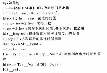 假定HSI只用到HSI.0。初始化时,设置IOC0为01H,选择HSI.0为事件输入引脚。设定HSI MODE寄存器为01H,即,每个正跳变为一个事件的触发方式。在采样中断中读取时间值,先查询IOS1.7,若该位为1,则表明保持寄存器已加载,可对HSI的事件予以读取。读取HSI STATUS和HSI TIME两个寄存器,进行处理。