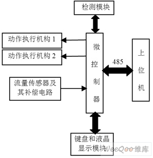 系统的硬件设计采用模块式结构,结构紧凑,有利于调试和维护。系统硬件电路设计包括四大部分:单片机核心控制模块、气体流量检测模块、液晶显示模块、控制执行模块和通信模块。