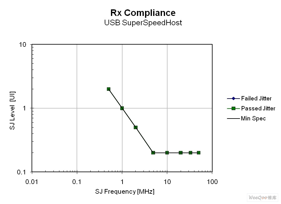 图4:USB3.0接收量测结果。横轴为时基误差的频率,纵轴为时基误差的振幅。绿点表示位元错误率低于10-12的测试基准点。黑线为测试基准规范。