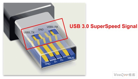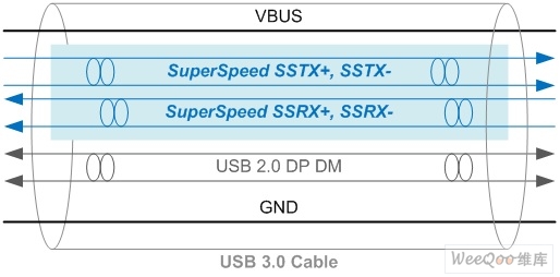 图2:USB3.0缆线示意图,蓝色部分为SuperSpeed5Gbps信号。