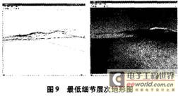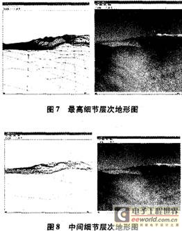图7、图8、图9分别是不同的细节层次下对同一组地形数据进行的地形建模,左图是网格图,右图是实体图。由左图可以看出渲染的多边形面片数明显减少,而右图的实体效果当视点离地面很远的时候不会有明显的变化。