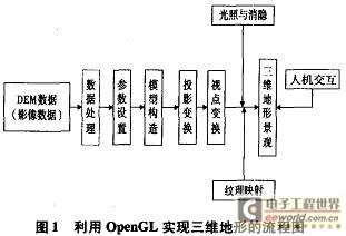 基于 OpenGL技术的三维地形的基本实现过程如图 1所示 ,而本文将重点论述基本过程中的三维数字地形模型构造的方法。下面将介绍利用 0penGL技术构建三维地形的建模技术和实现方法" title="实现方法">实现方法。