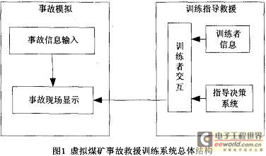 虚拟煤矿事故救援训练系统借助虚拟现实技术,将事故现场在计算机中真实再现。队员可以像操纵一个 PRG游戏一样。可以置身于~个真实的煤矿中,可以身临其境的去体验煤矿的各个环节和完成各种训练任务。主要训练救护队员对突发事故的实时处理能力,如何救护,将损失降低到最低限度。救护队员通过自己的经验并结合训练指导系统给出的参考指导,从而做出正确救援判断。图 1所示为虚拟煤矿事故救援训练系统总体结构。
