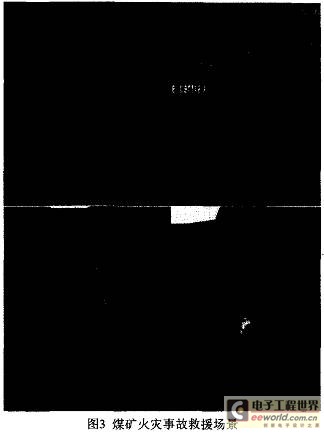用户在场景中用替身(Avatar)表示,在进入游戏训练时,用户可 以选择一个空闲的Player作为 自己的替身,在每一个场景需要选择相应的装备,执行相应的操作,并获得相应的积分何扣分,完成训练的目的。图3所示是对煤矿火灾事故救援训练场景的模拟过程:发现火灾一接警调度一灭火过程。首先是被训练队员发现火灾,并向上级报告火灾情况(发生地点、气体、温度、通风设施、巷道破坏情况等)。然后根据指挥,开展救援行动。