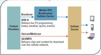- 上述三种传播方式的完美整合不仅能够实现最佳的用户体验,而且还能为蜂窝运营商带来创收机遇。运营商可以面向广大用户提供广播电视节目(一般为 20 个频道)。正处于设计阶段的、全新的手机应用将允许用户利用便捷的单播方法按需检索特定的节目内容。互动广告使用户可以通过手机浏览器购买或查看刚刚在电视广播中观看到的某件商品。诸如个人视频记录器 (PVR) 等功能可用于在蜂窝系统使用率较低(如夜间)期间下载并存储大量的音视频文件。