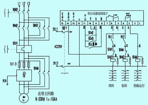 悬臂皮带机控制如附图所示:电动机主回路由断路器9QM2,正反转控制接触器9KM2、9KM3,旁路运行接触器9KM4,热继电器9EH1、开云棋牌官网在线客服保护熔断器FU1-3,软起动器SIEMENS-3RW2236组成(斗轮驱动电机单向运行其控制原理与悬臂皮带机控制相同)。