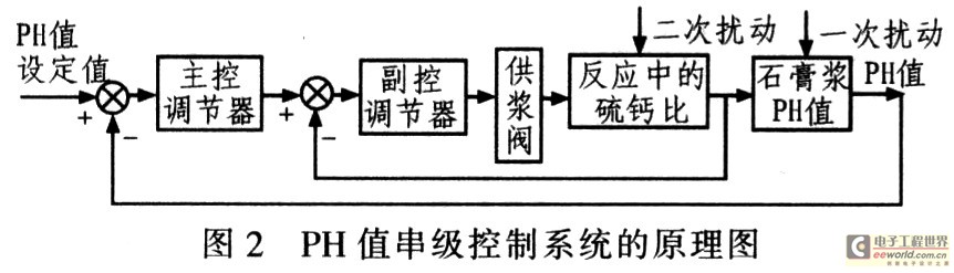 采用普通的PID控制时,由于PH调节具有较大滞后特性,控制效果并不理想。考虑到影响吸收塔PH值的主要因素是烟气中的硫元素与浆液中钙元素的摩尔比,因此,这里在脱硫系统中使用串级PID控制。串级控制系统是将两个调节器串联起来工作,其中一个调节器的输出作为另一个调节器设定值的系统。串级控制系统分为主控回路和副控回路,对应回路的调节器分别称为主控调节器和副控调节器;对应回路的调节对象称为主控对象和副控对象;作用在两个回路中的扰动分别称为一次扰动和二次扰动。图2为采用串级控制的吸收塔内PH值控制系统原理图。