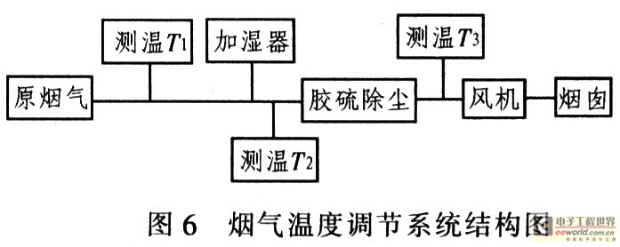 烟气温度调节系统由测温装置和温度调节装置构成,对于脱硫系统其温度调节方式是通过调节加湿器的加水量来调节系统温度,如图6所示。