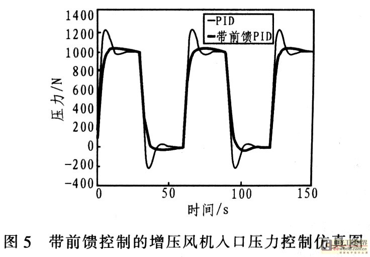 增压风机入口压力控制算法通常是PID调节,由于压力控制系统是滞后和时变的,常规PID算法不能达到良好效果。将锅炉负荷作为前馈量引入到调节中,通过调节锅炉负荷的前馈调节器动态补偿由负荷波动带来的压力扰动,降低增压风机导叶的动作频率,与普通PID控制相比,前馈控制系统明显可降低系统超调量。图4为控制系统原理框图。
