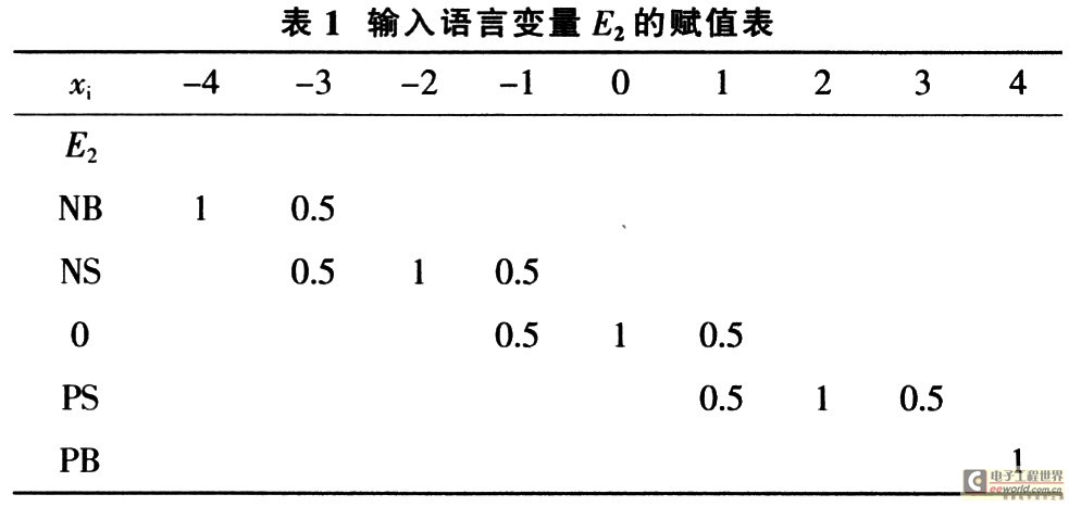 根据现场操作者的实践经验和控制策略。隶属函数基本采用等腰三角形的形式,设计出E2、△E2、U的语言变量在量化论域上的赋值表,如表1、表2和表3所示。