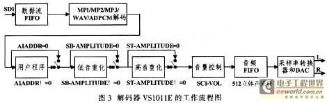 VS1011E的工作流程如图3所示。VS1011E的工作流程为:首先MP3或者WAV格式音频文件通过SDI总线进入芯片内部,并解码。解码后,如果SCL_AIADDR!=0,将会执行应用区代码,代码地址由相应的地址寄存器提供。然后,按照SCL_BASS寄存器(SB_AMPLITUDE位和ST_AMPLITUDE位)的设置,数据可能会被送到低音和高音优化器进行音效处理。此后,数据通过音量控制单元,同时备份到音频FIFO中。音频FIFO保持数据,并作为采样率转换器和DAC的输入。采样率转换器将所有不同采样率转换成CLKI/512,输送给DAC。DAC按位依次产生立体声模拟信号,这些信号紧接着送到耳机功率放大器中。