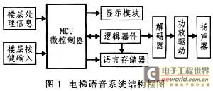 电梯控制系统的基本功能是根据用户的楼层按键信息,显示楼层数字,播报到达楼层语音。电梯语音系统框图如图1所示。