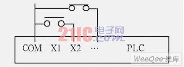 对于工业现场中经常会用到的开关、按钮等开关量信号,通常按照图1的配线方法接入plc的输入点,该方法以com端作为所有开关量输入信号的公共端,每一个开关或按钮接入一个plc的输入点。