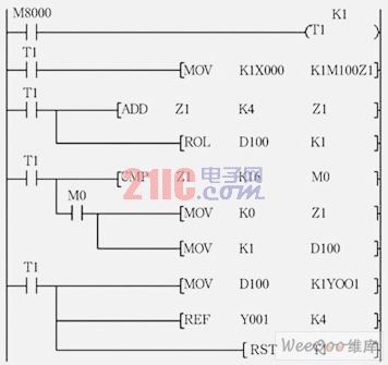 图3为软件流程图,基于上述考虑设计的软件程序(梯形图)如图4所示。每次扫描时间间隔100ms,16个开关量信息采集到plc后分别送入m100~m115保存,指令rol和ref的含义分别是循环左移和输出刷新。