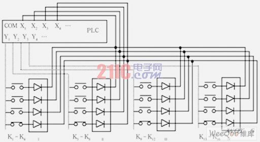 4块接口板分别由plc的4个输出y1~y4选通(用虚线画出),如当y1有效而y2~y4均无效时,接口板i被选通,此时k1~k4的信号被送入x1~x4,当y2有效而y1、y3、y4无效时,k5~k8的信号被送入x1~x4,另外两组信号的送入方法相同。在这种结构中,输出端y代替com作为公共端。