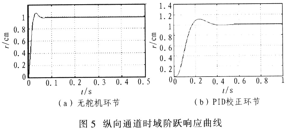 图5为纵向通道时域阶跃响应曲线,从图5仿真曲线可看出,在精确考虑舵机环节情况下,PID校正环节纵向通道时域阶跃响应曲线反应良好,超调量11.4%,上升时间170.6 ms调节时间(2%误差带)356.3 ms,稳态误差为0。