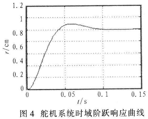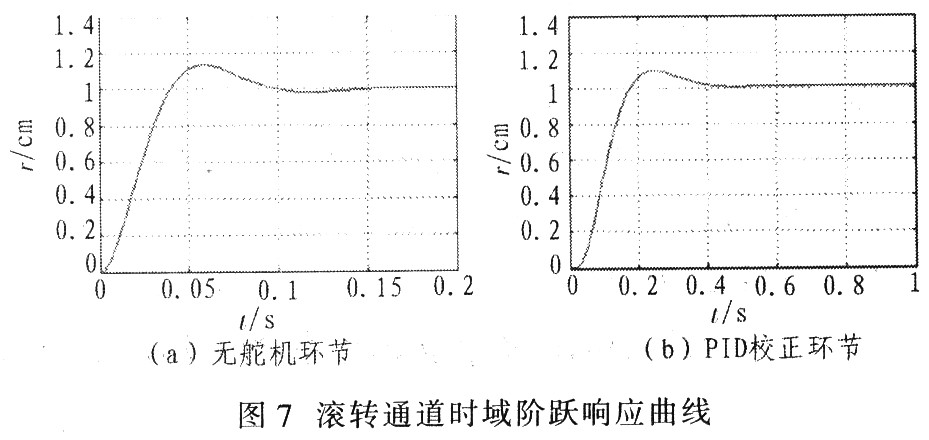 图6为横向通道时域阶跃响应曲线。从图6仿真曲线看出,在精确考虑舵机环节情况下,PID校正环节横向通道时域阶跃响应曲线反应良好,超调量11.4%,上升时间168.3 ms调节时间(2%误差带)347.1 ms,稳态误差为0。