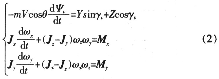 式中,-mVcosθ(dψv/dt)为导弹质心加速度的水平分量,“-”表示向心力为正,所对应的ψv为负,反之亦然。它是由角度正负号定义所决定的,dωx/dt、dωy/dt为导弹转动角加速度矢量在弹体坐标系轴上的分量,Jx、Jy、Jz分别为导弹绕弹体坐标系ox1、oy1、oz1轴的转动惯量,Mx、My分别为滚转力矩和偏航力矩,Y、Z分别为弹上的总空气动力沿速度坐标系分解的升力、侧向力,ωx、ωy、ωz分别为导弹绕弹体坐标系ox1、oy1、oz1轴的角速度。