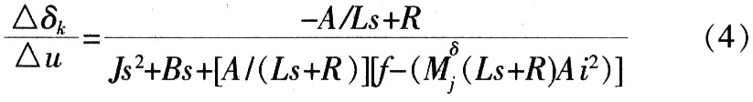 设减速比i,总转动惯量J,力矩M,输入电压u,电流I,电感L,电阻R,鼓轮的角速度与转角分别为ω和δk,舵偏角δ,电动舵机的力矩特性近似为A,机械特性近似为-B,Mj是铰链力矩,