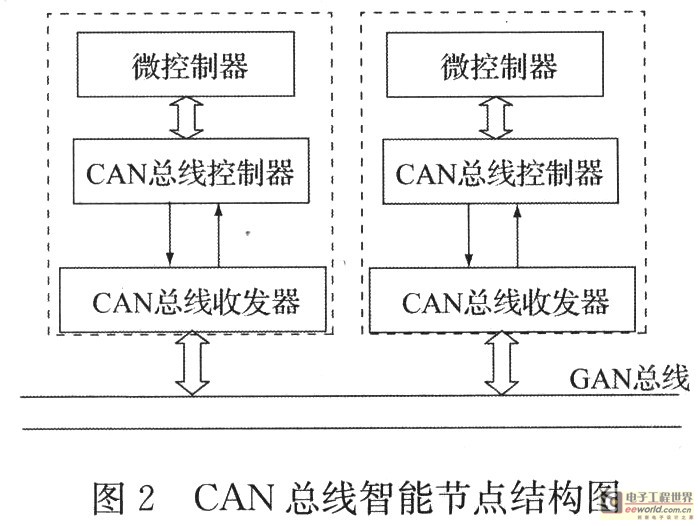 CAN总线智能节点在分布式控制系统中起着承上启下的作用。它位于执行机构所在的现场,一方面和上位机进行通信,以完成数据交换;另一方面又可根据系统的需要对现场的执行机构进行控制和数据采集。典型的CAN总线控制节点是由微处理器、CAN控制器、CAN接口构成,如图2所示。