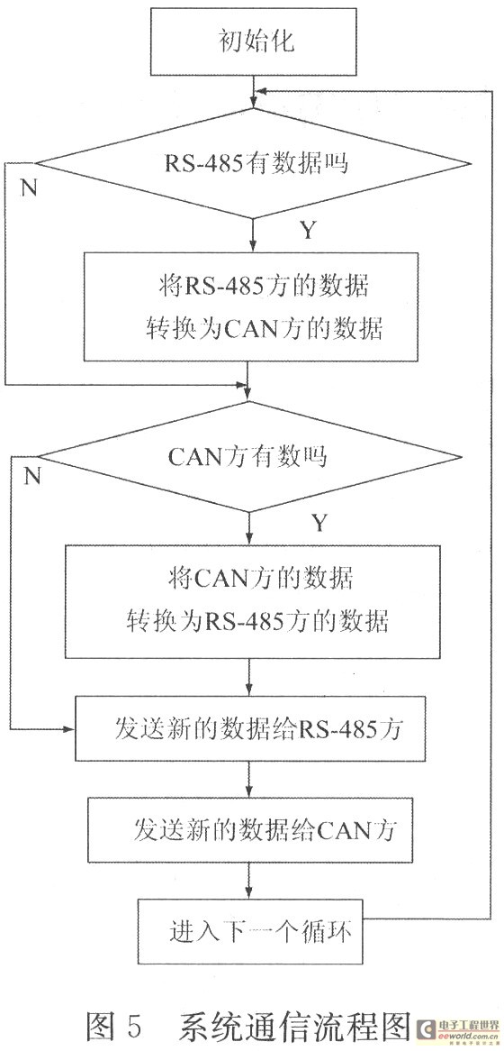 远程控制系统软件设计包括初始化程序与通信主程序设计。CAN初始化只能在复位模式下进行,初始化主要包括工作方式的设置,波特率参数设置和中断允许寄存器IER的设置。作为软件设计核心部分的是RS-485CAN接口通信编程,其程序流程图如图5所示。