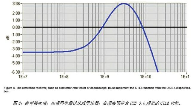 虽然设备或主机中的接收端均衡电路与具体实现有关,但USB 3.0标准为一致性测试规定了CTLE(图8)。这种CTLE必须在进行一致性测试测量(都是针对发送端测试,在本例中是接收端受压眼图校准)之前,由误码率测试仪(BERT)或示波器等参考接收端实现,并且通常采用软件模拟的方式。