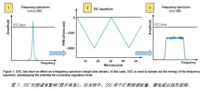在同步数字系统(包括USB 3.0)中经常使用SSC来减小电磁干扰(EMI)。如果不使用SSC,数字流频谱中的载频(即5Gbps)及其谐波处会出现大幅度的尖峰,并且有可能超过调整极限(图7)。