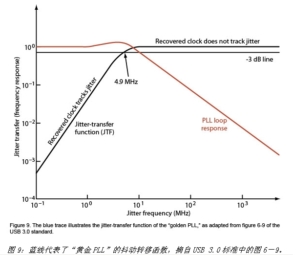 抖动测量时必须使用具有一致性抖动转移函数(JTF)的时钟恢复“黄金PLL”,如图9中的蓝线所示。JTF表明了有多少抖动从输入信号转移到下游分析仪。在本例中,-3dB截止频率是4.9MHz。
