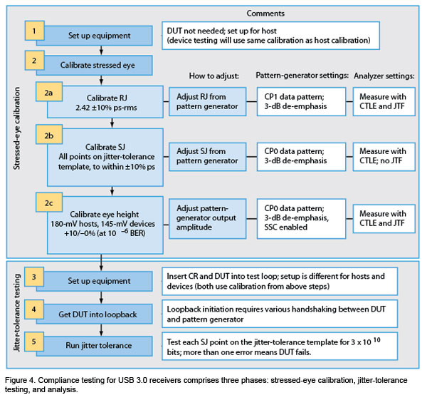 USB 3.0接收端测试类似于其它高速串行总线接收端的一致性测试,一般分为三个阶段,开始是受压眼图校准,然后是抖动容限测试,最后是分析。下面让我们看看这个过程的流程图(图4)。