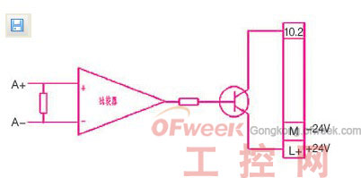 小车行走的距离通过旋转编码器反馈回来的脉冲接入plc的高数计数端子,通过计数值可以知道小车行走的长度,计算精度可达0.01mm。由于项目所用的高数计数器是ab正交输入方式,只需将a+、b+及公共端接入plc即可,而伺服控制器脉冲输出为a+ a- b+ b- z+ z-,在调试中发现,plc的高数计数值不稳定,误差很大,感觉有干扰存在,经分析认为是a- b- 是干扰源,因此我们采用以上电路(如图1所示),用比较器将a+ a-进行比较后经三极管开关接入plc,问题得了解决,则即提升了电压又抑制了干扰,取得了良好的效果: