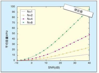 图3:具有N幅发送和接收天线的MIMO系统在保持总发送功率不变的条件下理论平均容量相对信噪比(SNR)曲线。